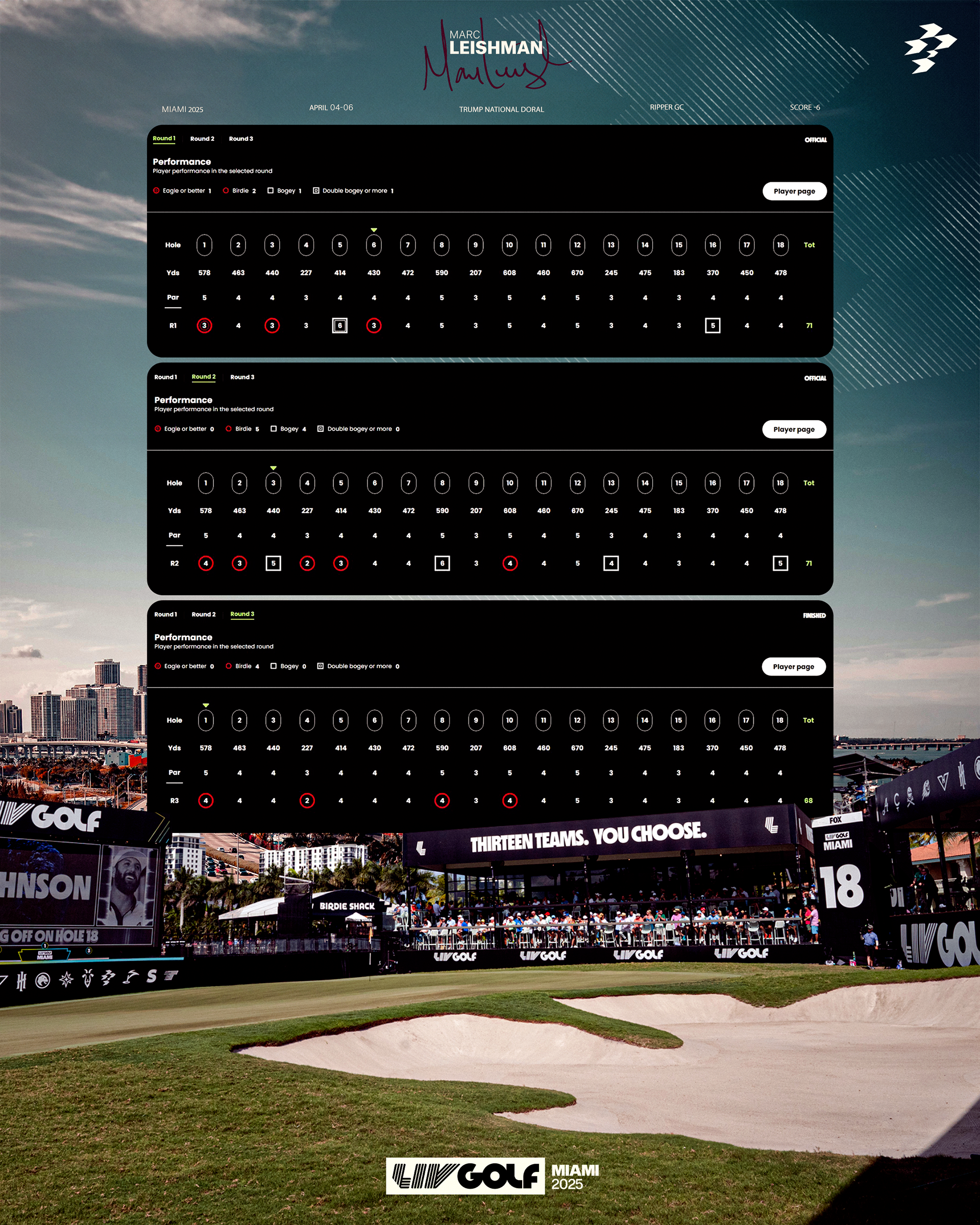 The Rippers GC survived one of the toughest scoring weeks in league history, capturing the team title at 4-over, the first over-par winning total in LIV Golf. Marc Leishman led the way, shooting the week’s only bogey-free round, a 4-under 68, to claim his first LIV Golf individual title at 6-under.