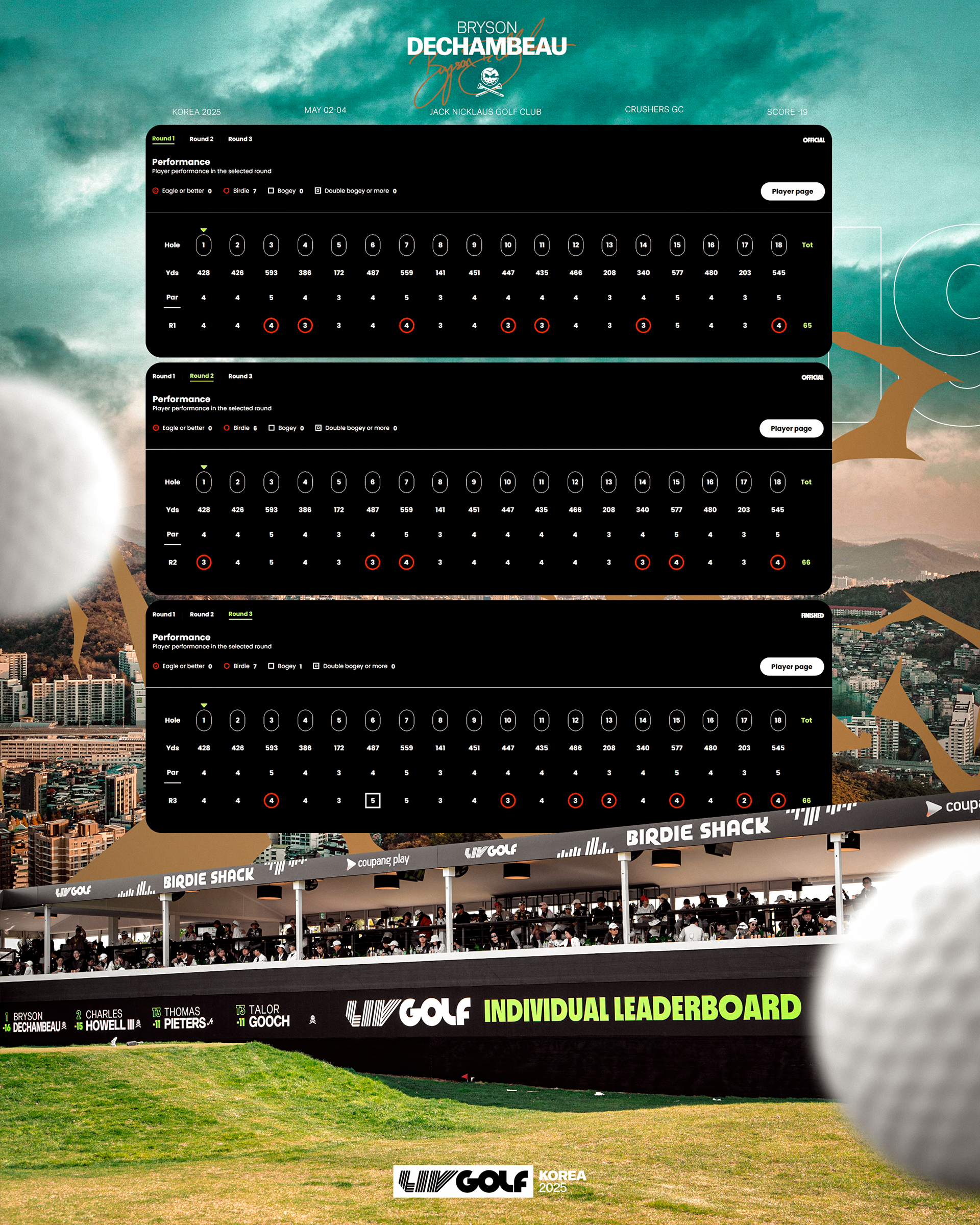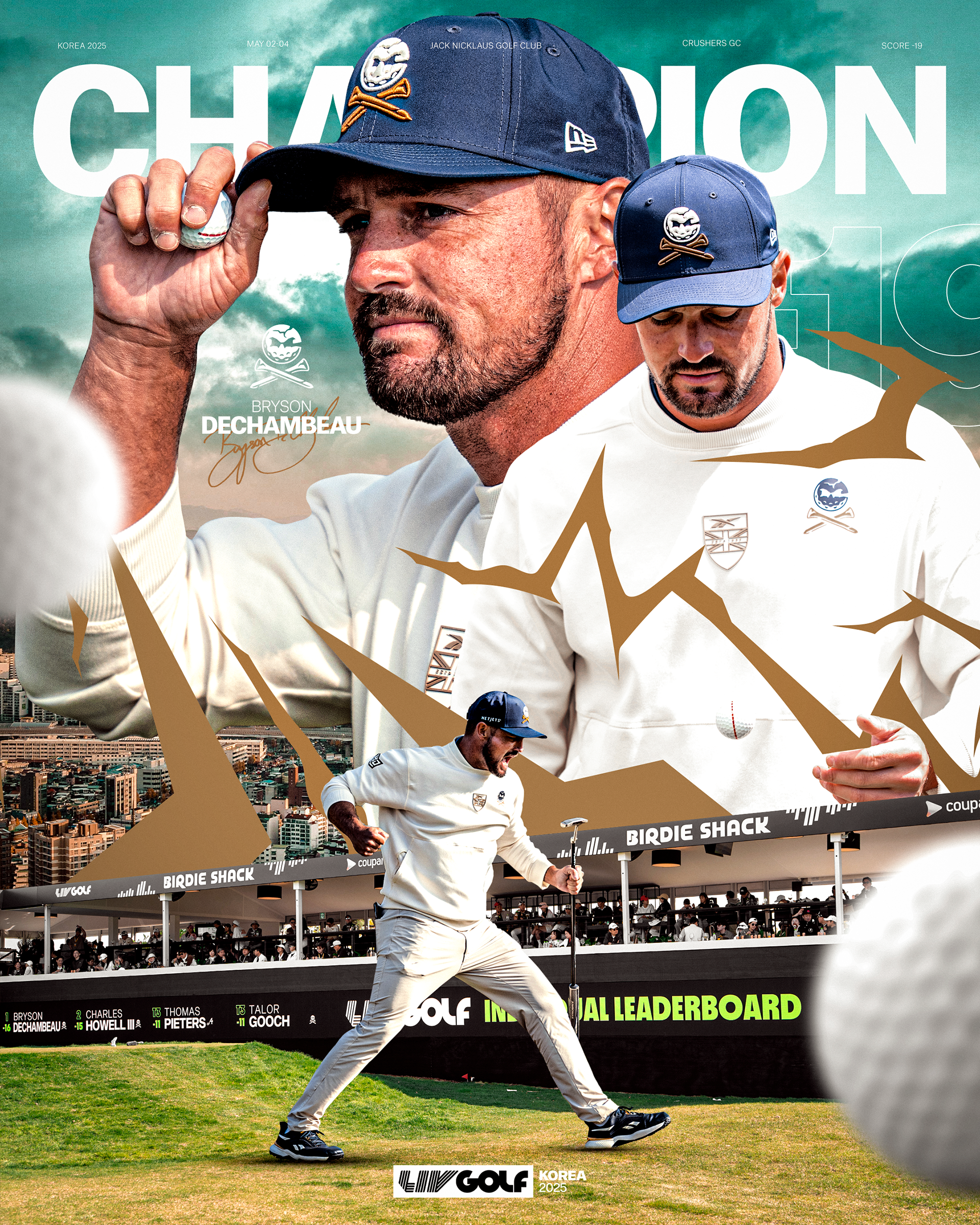 Bryson DeChambeau delivered at LIV Golf Korea, shooting a final-round 6-under 66 to edge teammate Charles Howell III and claim his third LIV Golf title. Locked in a tight duel all day, DeChambeau sealed the victory with a clutch 48-foot birdie putt on the 17th hole.